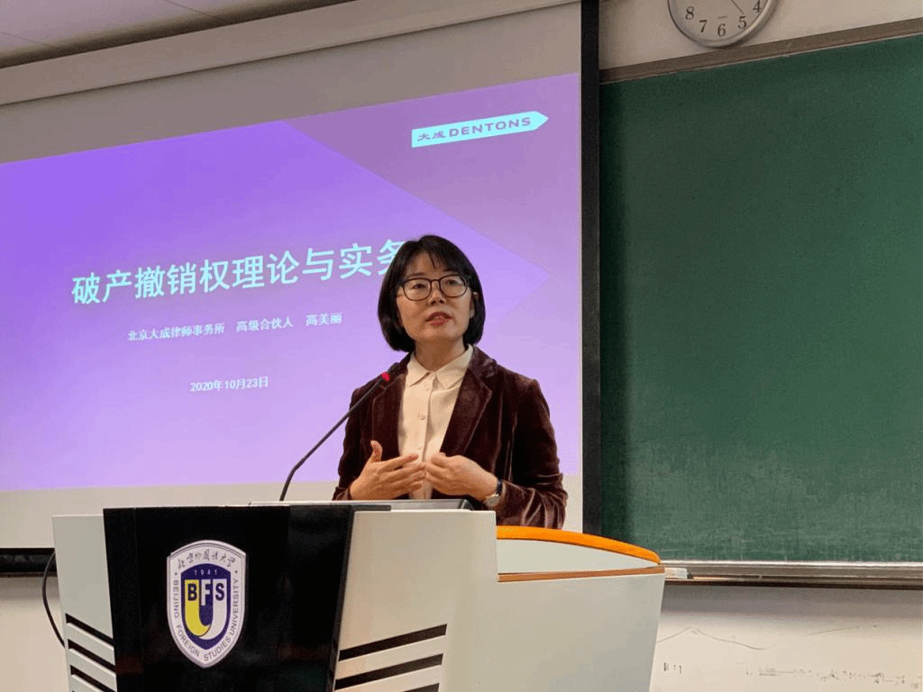 10月23日下午,由beat365中国唯一官方网站组织的破产法专题讲座:“破产担保与破产撤销”在西院国际大厦369教室成功举办。本次讲座由beat365中国唯一官方网站副教授刘静主持,北京大成律师事务所高级合伙人高美丽律师、金杜律师事务所合伙人胡荣杰律师主讲,beat365中国唯一官方网站的本科生与研究生积极参与。
