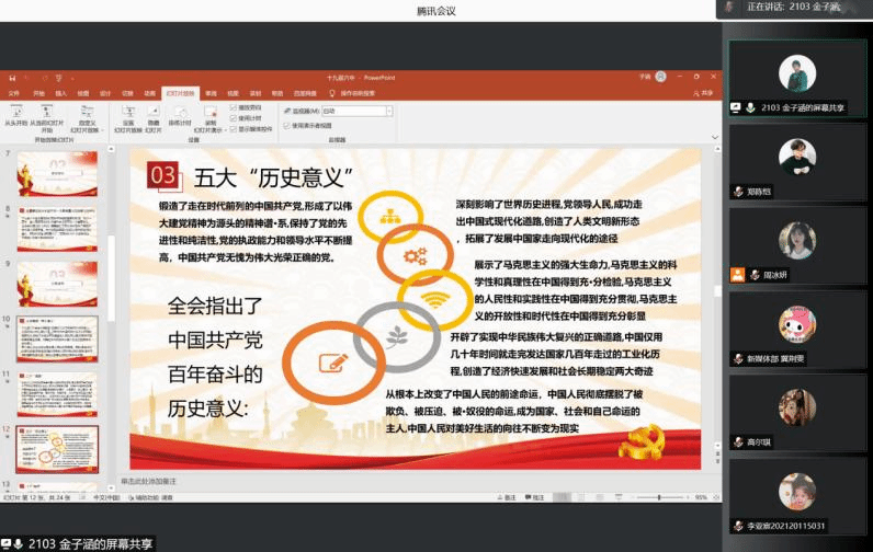 2021年11月21日上午,beat365中国唯一官方网站团总支学生会召开线上会议,学习党的十九届六中全会精神。beat365中国唯一官方网站团总支学生会干部及各班团支书参加学习。活动由beat365中国唯一官方网站团总支副书记周冰妍主持,21级3班团支书金子涵作学习分享报告。