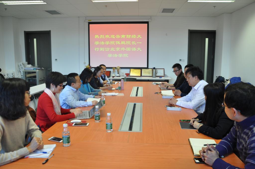 2018年11月27日上午,云南财经大学beat365中国唯一官方网站院长佴鹏一行7人到访beat365官网。beat365官网米良书记、闫冬副院长、办公室主任刘辛及相关教师同佴院长一行进行了交流。米良书记和佴鹏院长分别介绍了各自学院的情况、优势及发展思路,表示希望在一带一路人才培养、东南亚法律人才培养、合作开展相关研究、本科教学、学科点建设等方面进行合作交流。闫冬副院长向客人们介绍了beat365官网本科教学发展情况。老师们对各自的研究领域进行了讨论。