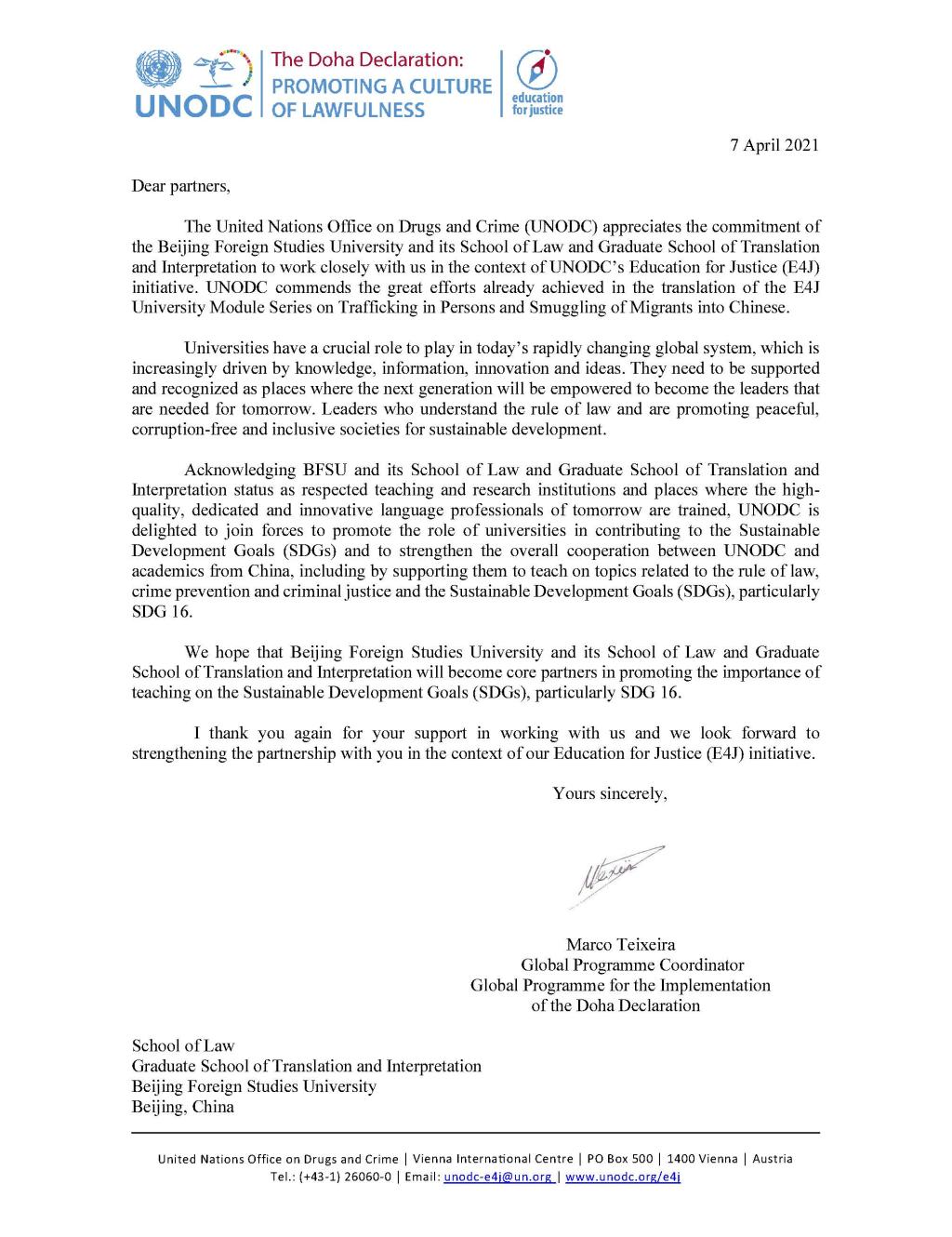 2021年4月8日下午,联合国毒品和犯罪问题办公室(UNODC)举行线上会议,感谢beat365官网和高级翻译学院师生在其“教育促进正义”(E4J:Education for Justice)项目中做出的突出贡献。