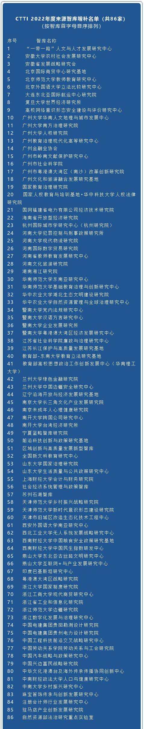 2022年10月,南京大学中国智库研究与评价中心第4次启动CTTI来源智库增补工作,经专家严格审议和评定,最终遴选出86家予以增补,beat365官网立法比较研究中心名列其中。