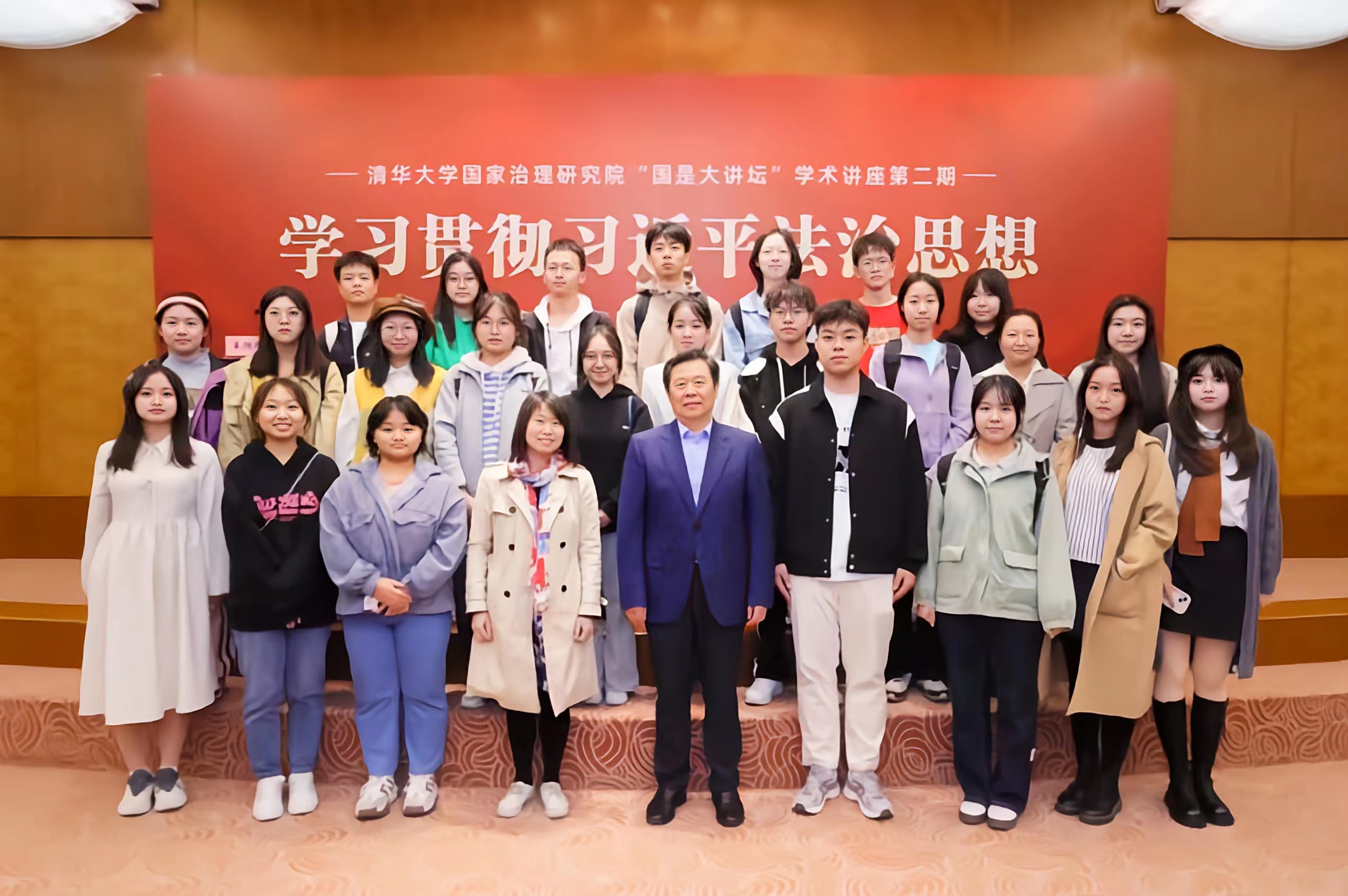 2023年10月21日星期六下午,beat365中国唯一官方网站康玉梅老师带领beat365中国唯一官方网站2023级本科新生3班全体同学和数名研究生同学前往清华大学,深入学习贯彻习近平法治思想,进一步引导学生学习习近平法治思想,坚定理想信念,聆听清华大学国家治理研究院“国是大讲坛”学术讲座第二期“学习贯彻习近平法治思想”。该讲座在清华大学中央主楼接待厅正式举行,十三届全国人大常委、全国人大监察和司法委员会副主任委员、中国法学会副会长、中国法理学研究会名誉会长徐显明教授担任主讲人,清华大学国家治理研究院院长、清华大学党委原常务副书记姜胜耀主持。