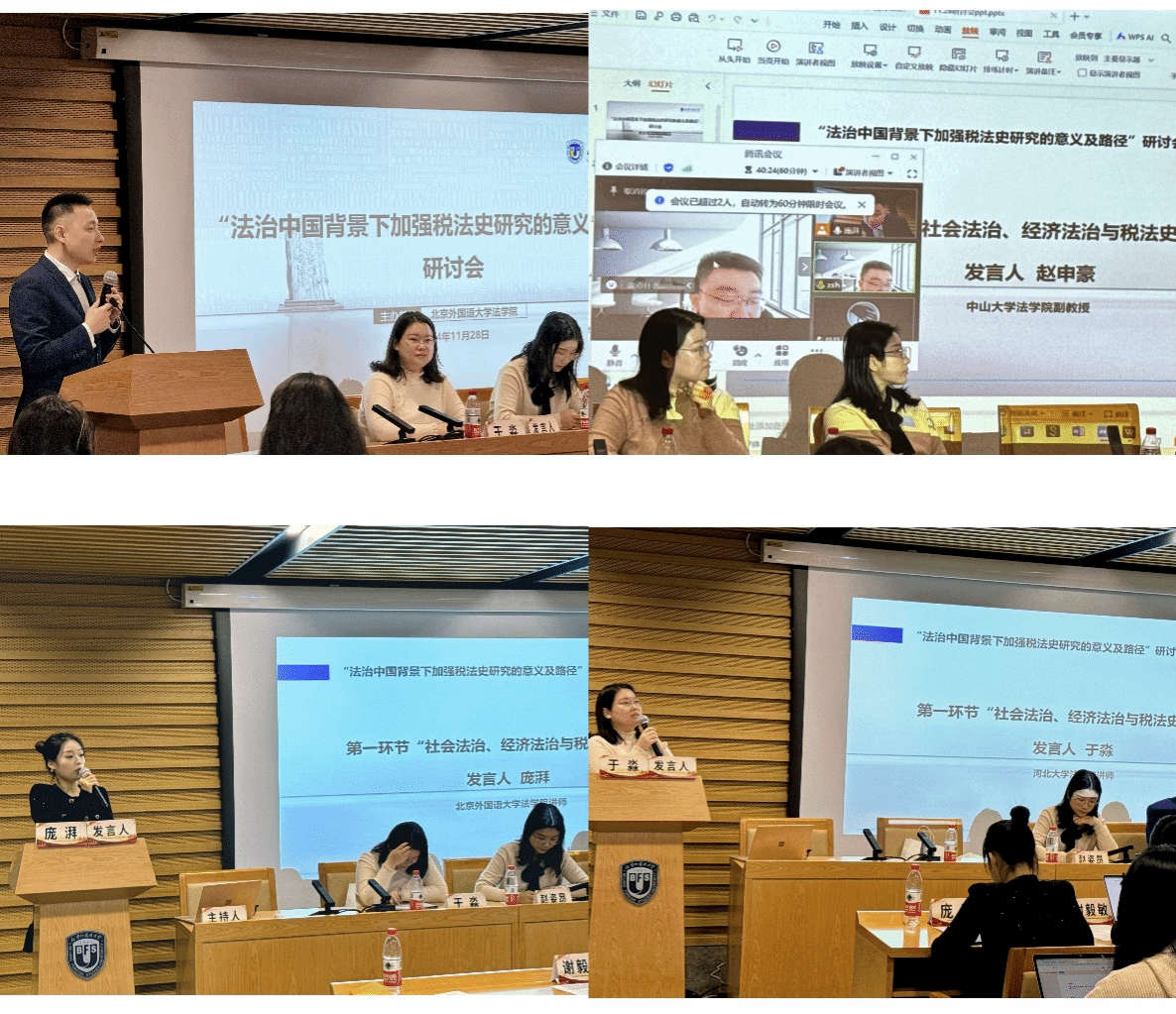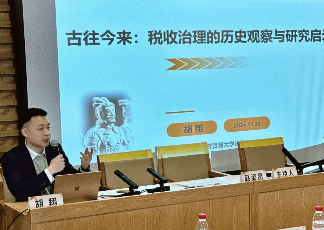 会议的第一环节由首都经济贸易大学副教授胡翔老师主持,各学者围绕“社会法治、经济法治与税法史研究”这一中心主旨发表了真知灼见。赵申豪副教授以土地税为类比点,从限制数据垄断是否需要数据课税这一视角探讨税法史。庞湃老师从唐宋的两税法、宋朝的市舶法、商税三个税种入手提出古代税法对现代税法的历史借鉴。于淼老师从领域法学的视角出发,从三个部分探讨在法治中国的背景下,对税法史的研究不仅是对税收制度演变的深刻洞察,也是为当前以及未来法治建设提供了宝贵的知识支撑。