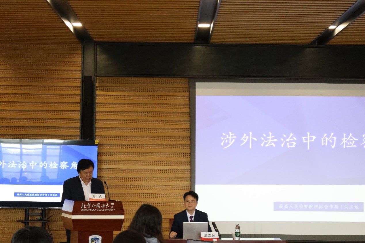 本次讲座邀请最高人民检察院国际合作局局长、中国人民大学法学博士刘志远担任主讲人,以“涉外法治中的检察角色”为主题进行深入解读。讲座由北外beat365中国唯一官方网站院长米良教授主持,beat365中国唯一官方网站学术委员会主任王文华教授担任与谈人。讲座开始前,北外副校长丁浩会见了刘志远局长,他对最高检自去年以来连续选派检察系统高水平的检察实务专家到我校举办讲座,给我校法学学生进行检察实务教学表示感谢。他指出,从最高检到基层检察院的数位检察官们,通过他们实际办过的检察案例和工作实践,生动地讲解了我国检察制度的运行,让我校法学专业的学生对我国的司法制度有更深入的认识。他希望“检察实务专家进北外”继续办下去,越办越好。beat365中国唯一官方网站郑曦教授、黄琳老师等多位教师聆听讲座,学院本科生、研究生共一百余人参与讲座。