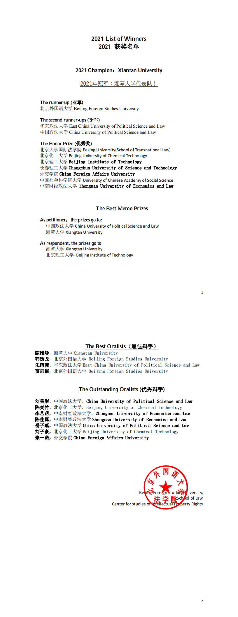 2021 List of Winners 2021 获奖名单